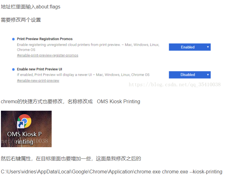 方案1 第一种没有去尝试,所以先讲讲第二种解决方案,通过前端控制浏览器打印,但是百度一圈下来的解决方案都是通过设置浏览器参数,然后创建一个快捷程序并设置启动参数,操作很简单,但实在不符合需求,总不能给每个客户也这样配置一边吧,所以第二种也pass。
