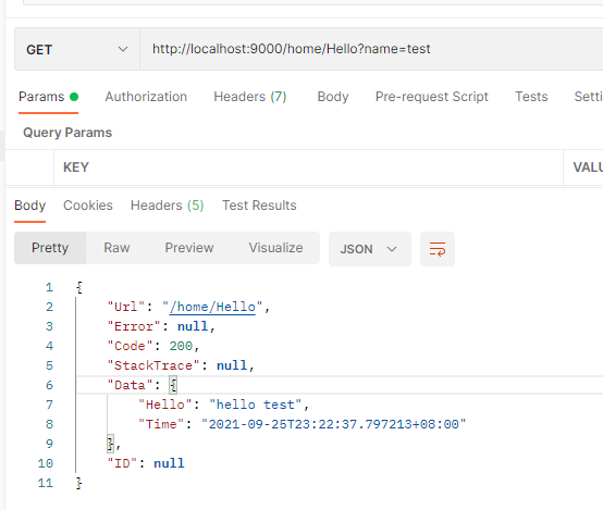 http://localhost:9000/home/Hello?name=test 返回成功