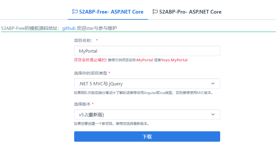 创建应用程序 使用52abp启动模板(https://www.52abp.com/Download)创建一个名为“**MyPortal**”的 Web应用程序。